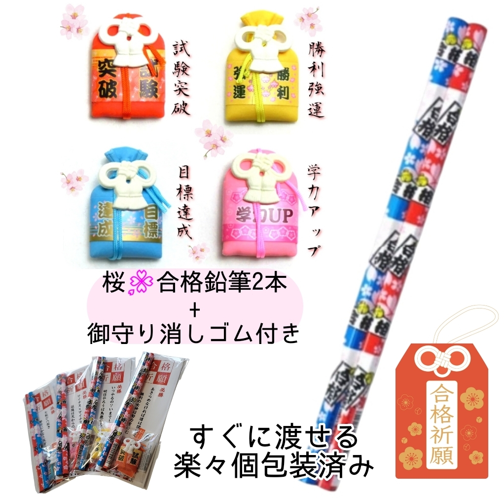 金色の合格(五角)鉛筆に【合格祈願】の文字が入っています。 3 色混同セット商品で、指定の色を選ぶことはできません。 お守り消ゴムは全4色(赤、黄、ピンク、水色) 各色順不同で入っています。
