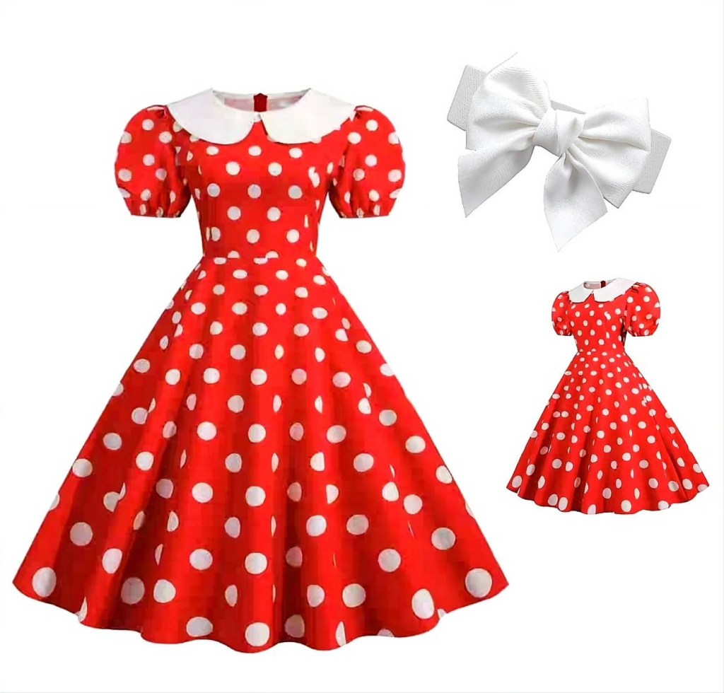 レトロなドット柄ワンピースとリボンベルトの2点セットです。
